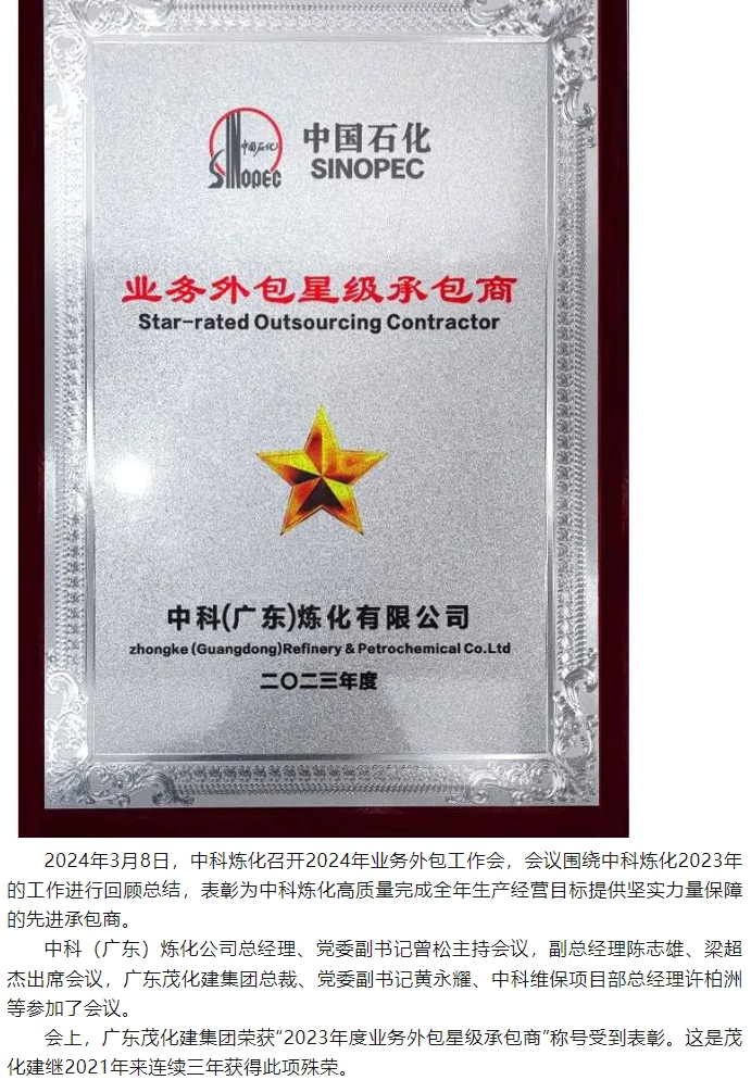 喜報:榮獲中科煉化“2023年度業務外包星級承包商”稱号