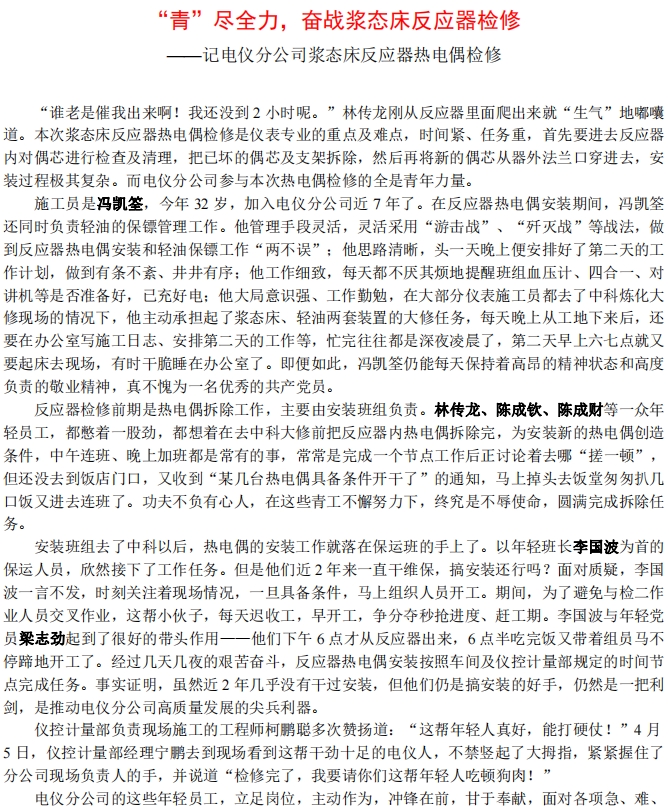 記電儀分公司漿态床反應器熱電偶檢修