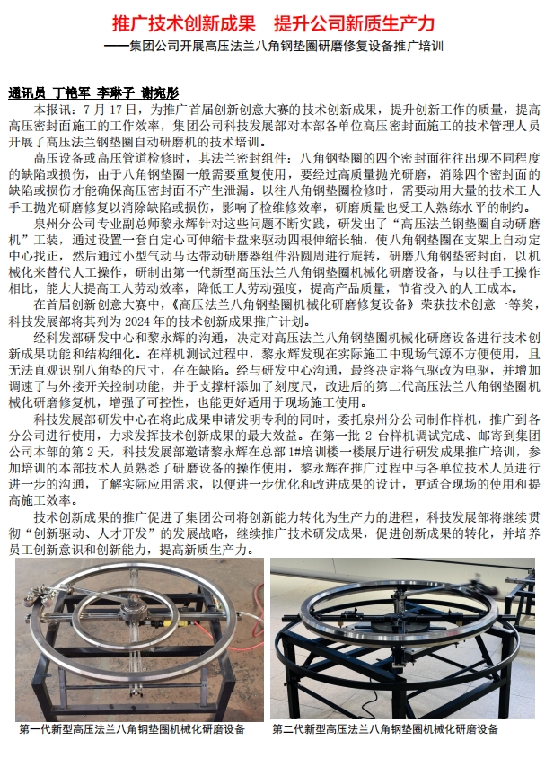 推廣技術創新成果 提升公司新質生産力 ——集團公司👯🏾‍♂️開展高壓法蘭八角鋼墊圈研磨修